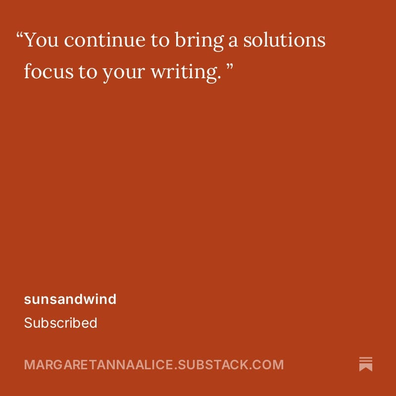 I especially want to thank those of you who have taken the time to write a private message to me when you subscribe. I read and cherish each note.