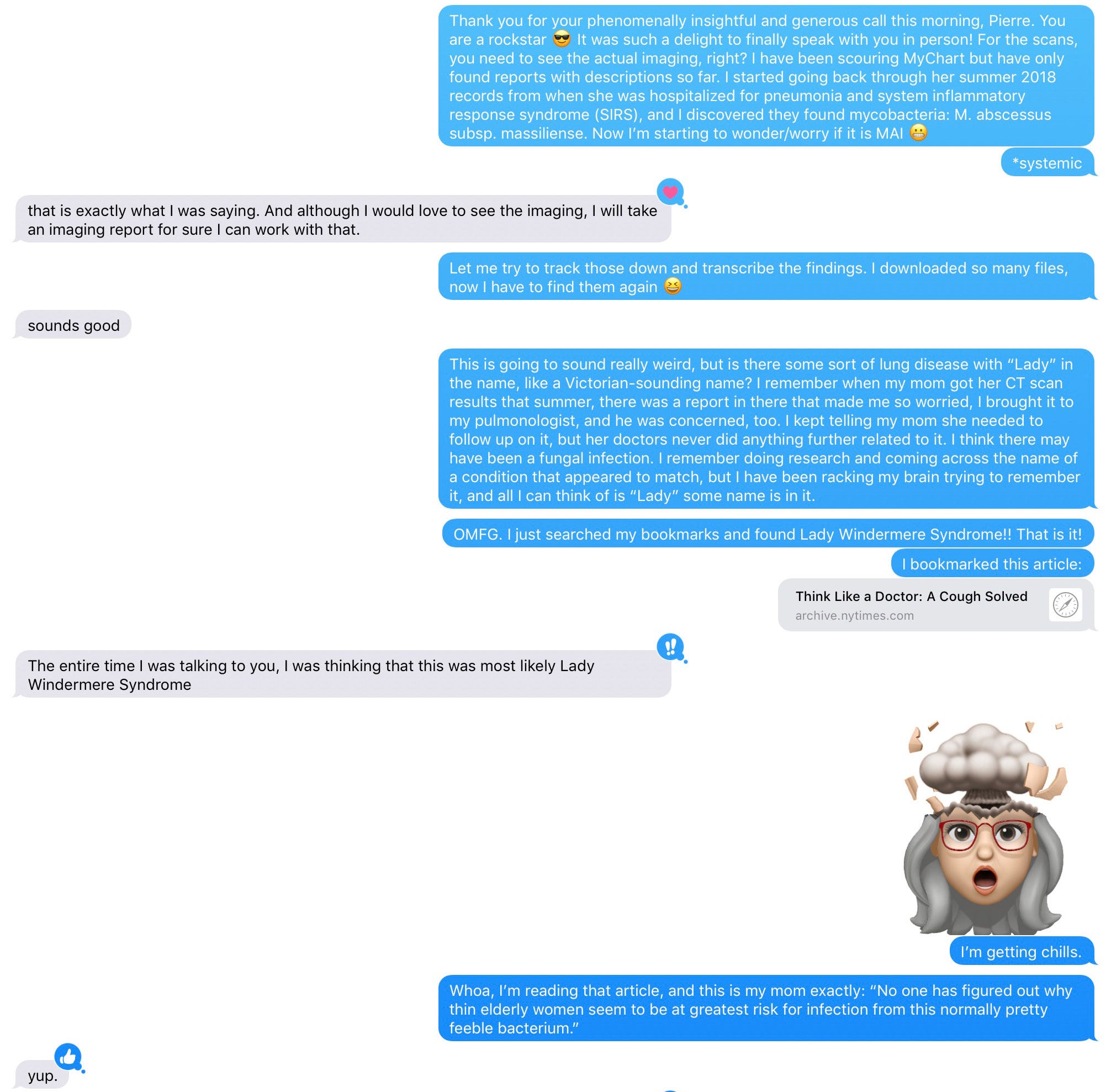 Thank you for your phenomenally insightful and generous call this morning, Pierre. You are a rockstar 😎 It was such a delight to finally speak with you in person! For the scans, you need to see the actual imaging, right? I have been scouring MyChart but have only found reports with descriptions so far. I started going back through her summer 2018 records from when she was hospitalized for pneumonia and system[ic] inflammatory response syndrome (SIRS), and I discovered they found mycobacteria: M. abscessus subsp. massiliense. Now I’m starting to wonder/worry if it is MAI 😬
