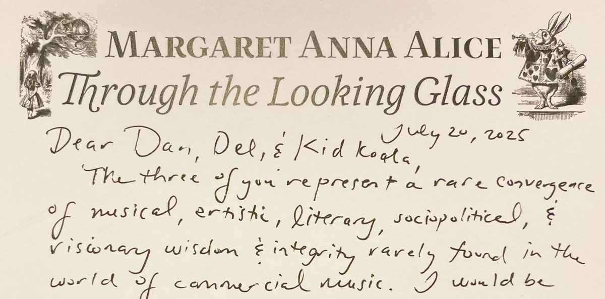 The night before the trip, I’d packaged up three Mistakes Were NOT Made shirts and three signed copies of my dystopian fairy tale along with a handwritten card to Dan, Del, and Kid Koala (Eric) proposing a potential collaboration.
