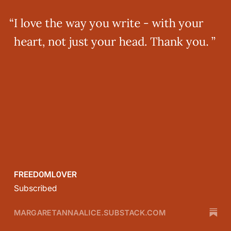 I especially want to thank those of you who have taken the time to write a private message to me when you subscribe. I read and cherish each note.