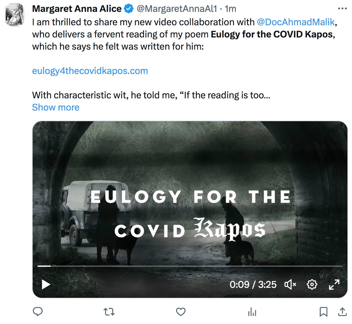 I sent him some pieces that seemed like a good fit for him, the first being Eulogy for the COVID Kapos, which he would later tell me he felt was written for him.