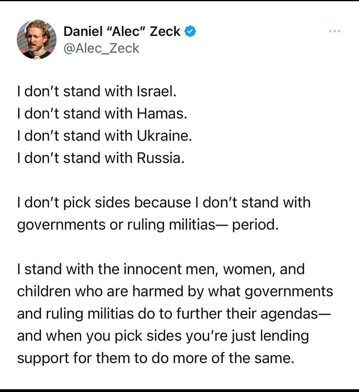 “Murdering innocent people for the crimes of leaders/governments/groups does not make murdering innocent people right. People are not interchangeable abstractions but individual human beings, accountable for their own actions and behavior, not that of leaders/governments/groups who claim to represent them while treating them as abstract fodder for their own ends.”