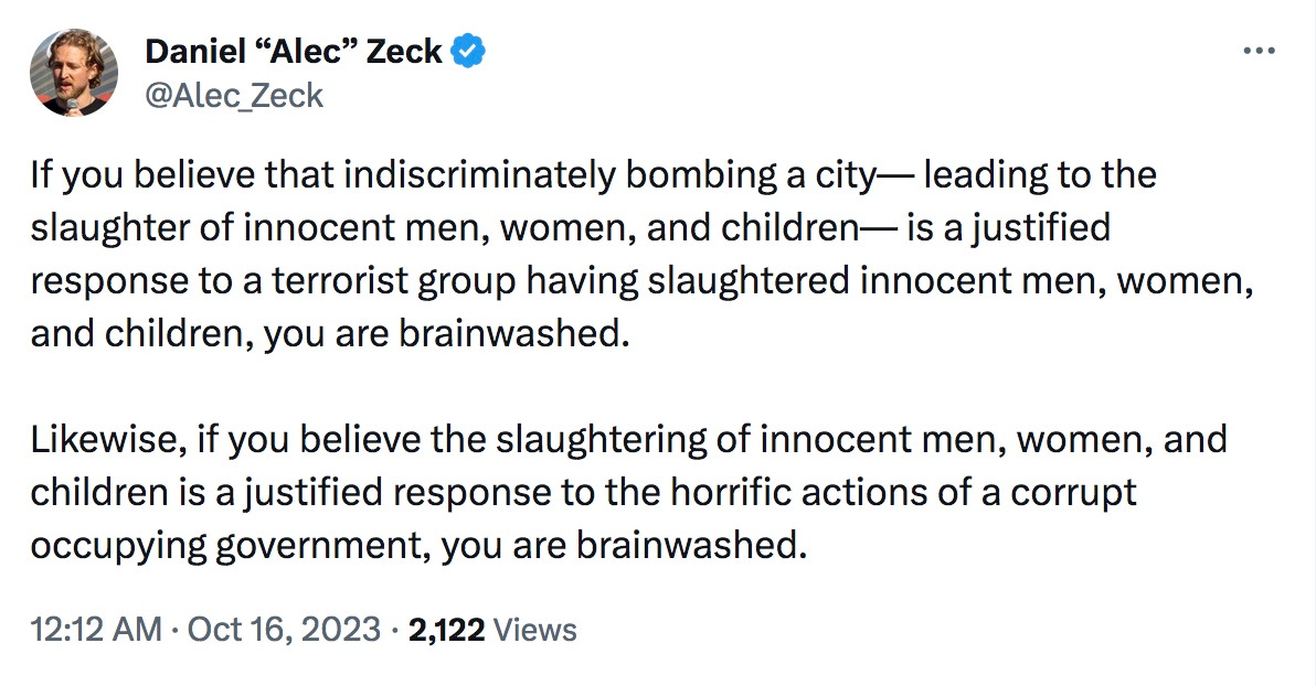 I recently had an exchange an X with an Israeli reader after I posted two quote tweets accompanied by the opening stanza of Mistakes Were NOT Made with the added line, “The Gazan genocide is not a mistake.” This was following the bombing of Ahli Arab Hospital, “the last fully functional hospital in Gaza City.”