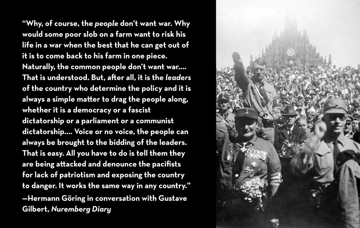 “Why, of course, the people don’t want war. Why would some poor slob on a farm want to risk his life in a war when the best that he can get out of it is to come back to his farm in one piece. Naturally, the common people don’t want war; neither in Russia nor in England nor in America, nor for that matter in Germany. That is understood. But, after all, it is the leaders of the country who determine the policy and it is always a simple matter to drag the people along, whether it is a democracy or a fascist dictatorship or a parliament or a communist dictatorship.… Voice or no voice, the people can always be brought to the bidding of the leaders. That is easy. All you have to do is tell them they are being attacked and denounce the pacifists for lack of patriotism and exposing the country to danger. It works the same way in any country.”