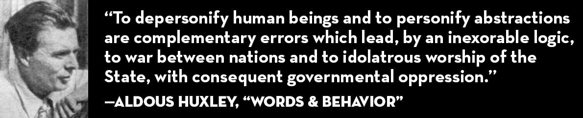 In addition to rehumanizing the people on the side defined as the enemy, we also need to reverse the second part of Huxley’s formula, the personification of the State: