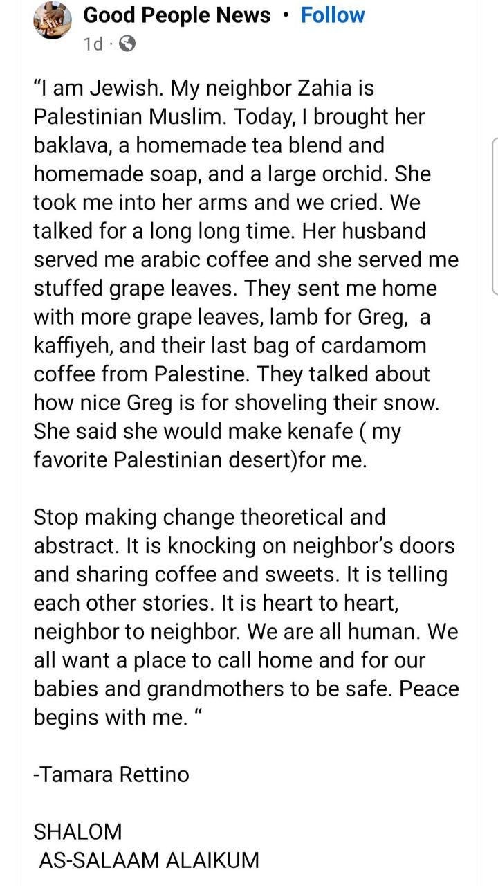 You said you love Arabs, that one saved your life before. Find one individual, whether it be that person or someone else, you can have a conversation with. Just talk. And listen. And share one another’s suffering. Feel each other’s humanity.