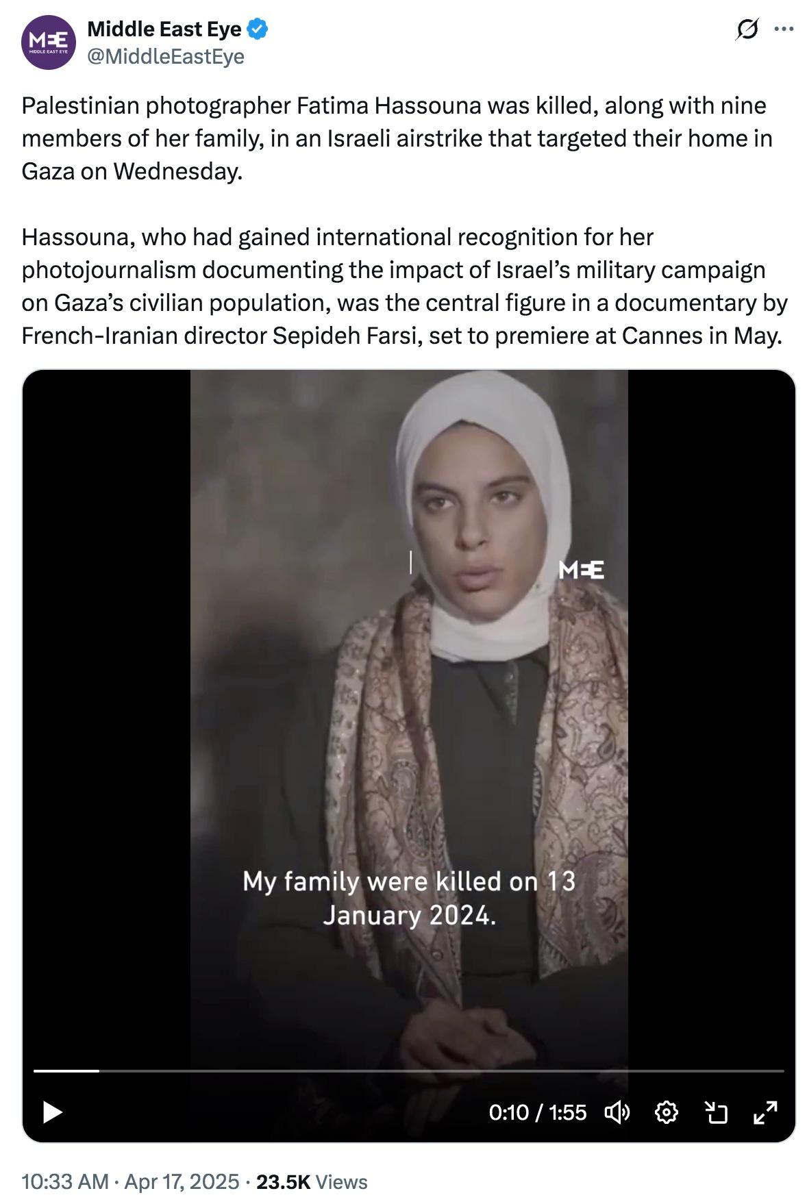 Yes, Israel, that beacon of holiness that has assassinated more journalists than have been killed “in the past seven major U.S.-involved wars combined,” including twenty-five-year-old photojournalist Fatima Hassouna within a day of her documentary being accepted at Cannes. It wasn’t enough to have exterminated eleven civilian members of her family at home on January 13, 2024. The State of Israel added Fatima and nine more members of her family to their kill list on Wednesday, April 16, 2025. Because that’s what good guys do, right?