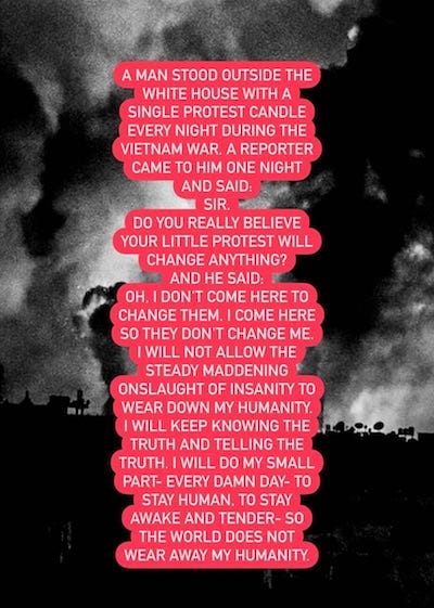 Don’t let them drag you to their bidding. Shine a light on the exit—peace, diplomacy, rediscovering each other’s humanity—even if the propagandists call you the enemy for doing so.