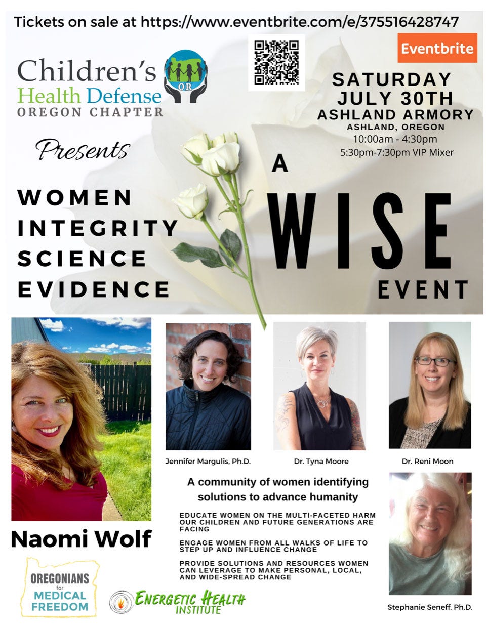 Children’s Health Defense – Oregon Chapter is sponsoring a WISE (Women Integrity Science Evidence) event next Saturday, July 30, in Ashland, Oregon! Dr. Naomi Wolf, Dr. Jennifer Margulis, Dr. Stephanie Seneff, Dr. Tyna Moore, and Dr. Reni Moon will be speaking. See the Oregon Chapter website for details.