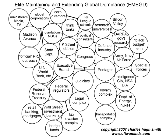 “Mills wrote in his 1956 masterpiece The Power Elite, America was ruled by those who control the ‘strategic command posts’ of society—the big corporations, the machinery of the state, and the military establishment. These dominant cliques were drawn together by their deep mutual stake in the ‘permanent war economy’ that had emerged during the Cold War. Though political tensions could flare within the power elite, Mills wrote, there was a remarkable unity of purpose among these ruling groups. The top corporate executives, government leaders, and highranking military officers moved fluidly in and out of one another’s worlds, exchanging official roles, socializing in the same clubs, and educating their children at the same exclusive schools. Mills called this professional and social synchronicity ‘the fraternity of the successful.’