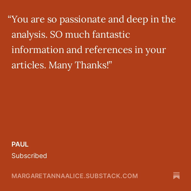 If you go to MargaretAnnaAlice.com, the Substack is called Margaret Anna Alice Through the Looking Glass. Sign up for notifications. You can read my Anatomy of a Philanthropath series, which covers a lot of this in detail, and then I will be publishing my notes either today or tomorrow, sometime this weekend, so people can get the full details.