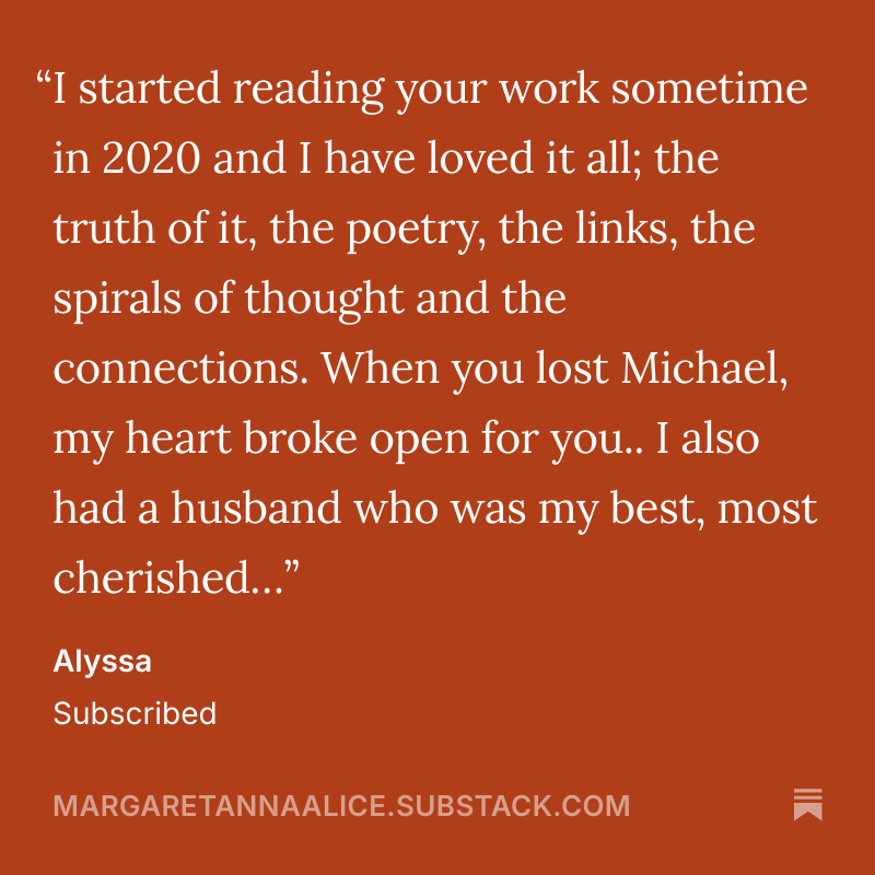 I especially want to thank those of you who have taken the time to write a private message to me when you subscribe. I read and cherish each note.