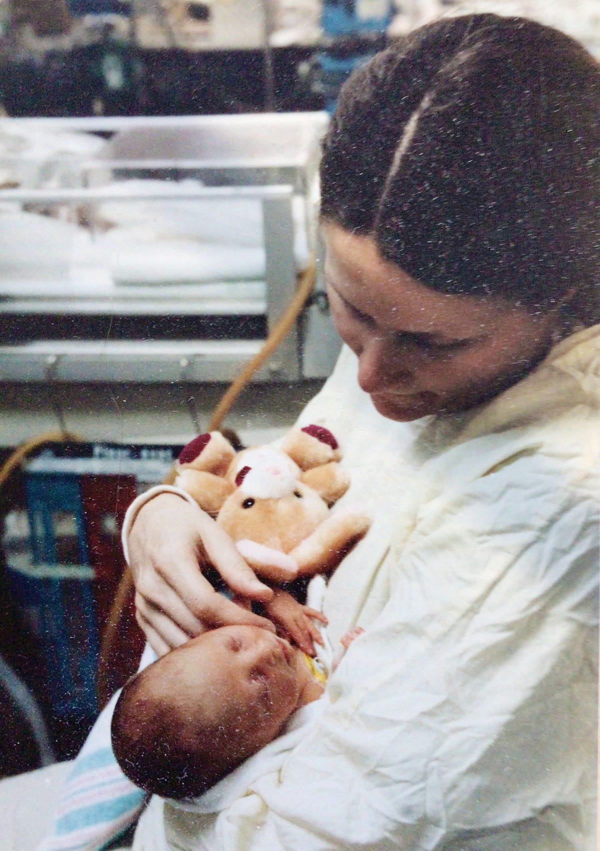 I look at the photo of Wookie Bear the first time my wife held her in intensive care. She was two months premature, four-and-a-half pounds at birth, no lungs functioning, and purple. Wife spent nine days total in a different hospital, so I was the one who went to intensive care every day to see her. I remember being terrified when they plopped her down in my arms, tubes all over the place in her. After my wife cried for not being able to see her after six days, the hospital gave her a pass to go to the intensive care unit. I took that photo.