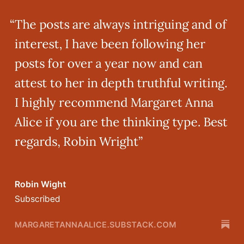 I’ve lost 103 paid subscribers since January, and it would be a lot more than that if so many of you hadn’t stepped up to support me while others understandably tightened their belts in this self-detonating economy. I know I haven’t been able to produce as much paid content while grieving, but I have many new pieces in the works and look forward to sharing those soon.