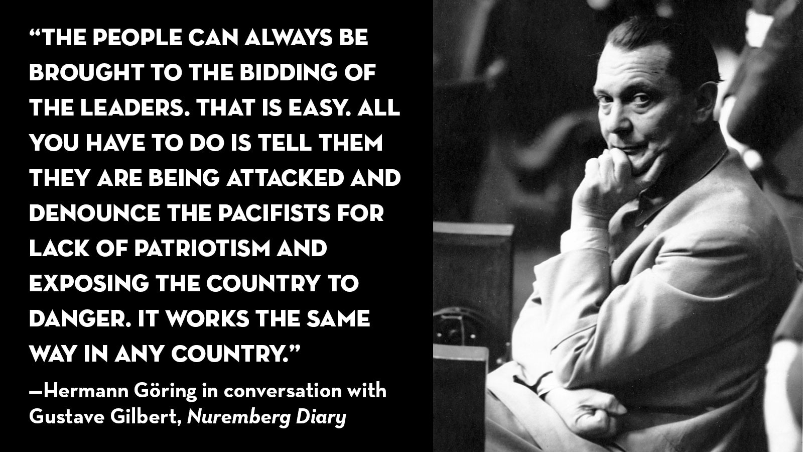 Those of us who are trying to save people from being fed into the carcass-grinder of democidal wars and policies are labeled the enemy per Hermann Göering’s trusty denounce-the-pacifists formula, which diverts the traumatized people’s wrath from the psychopathic perpetrators to those who are pulling back the curtain on their atrocities.