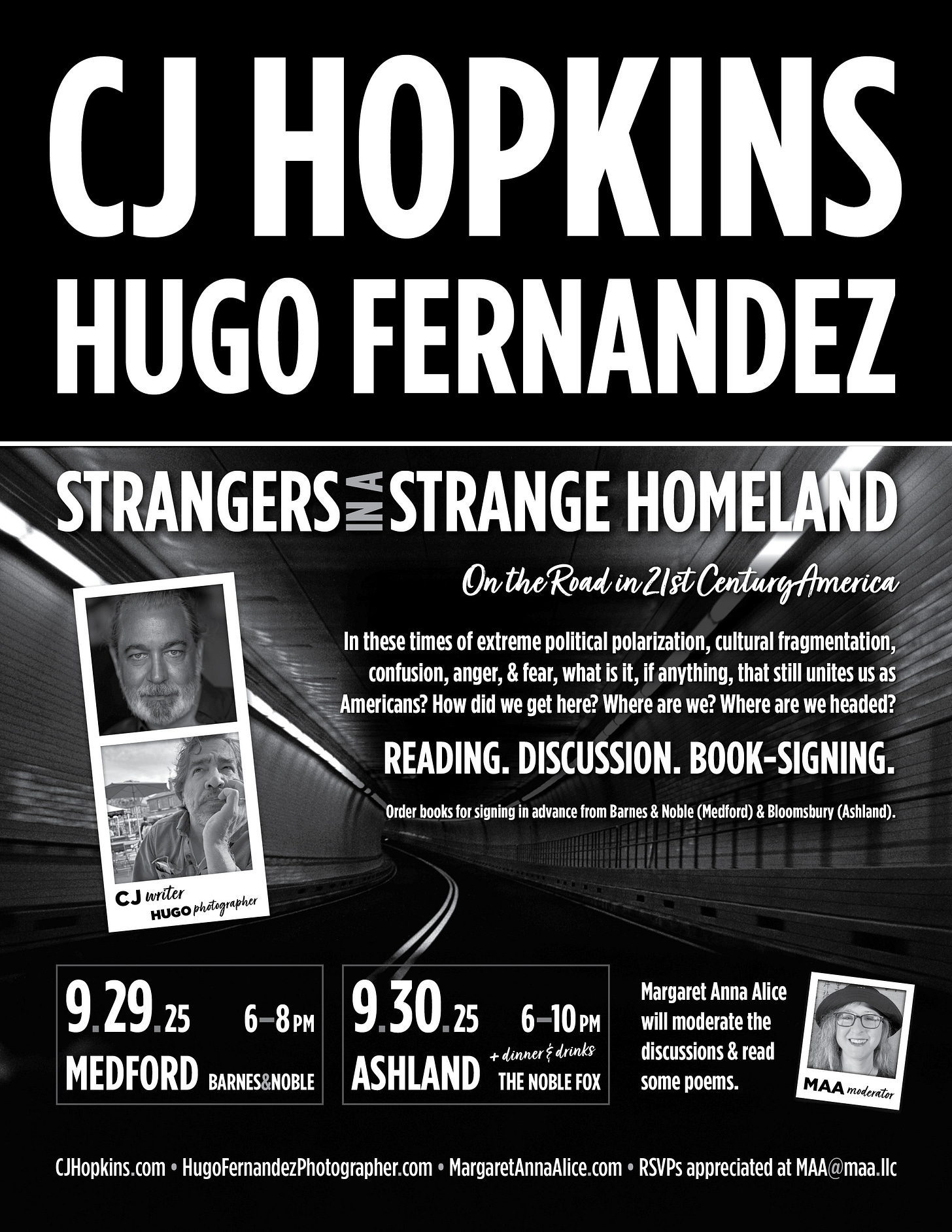 My brother-in-dissidence6 CJ Hopkins has kicked off the process through his America Road Trip project with his photographer friend Hugo Fernandez. They have been traveling across America speaking to ordinary folks of all backgrounds and political persuasions about the state of the country as they seek to discover what unites us in these highly polarized times. Their findings will be compiled in the book Strangers in a Strange Homeland (working title), published by Arcade Publishing in 2026.