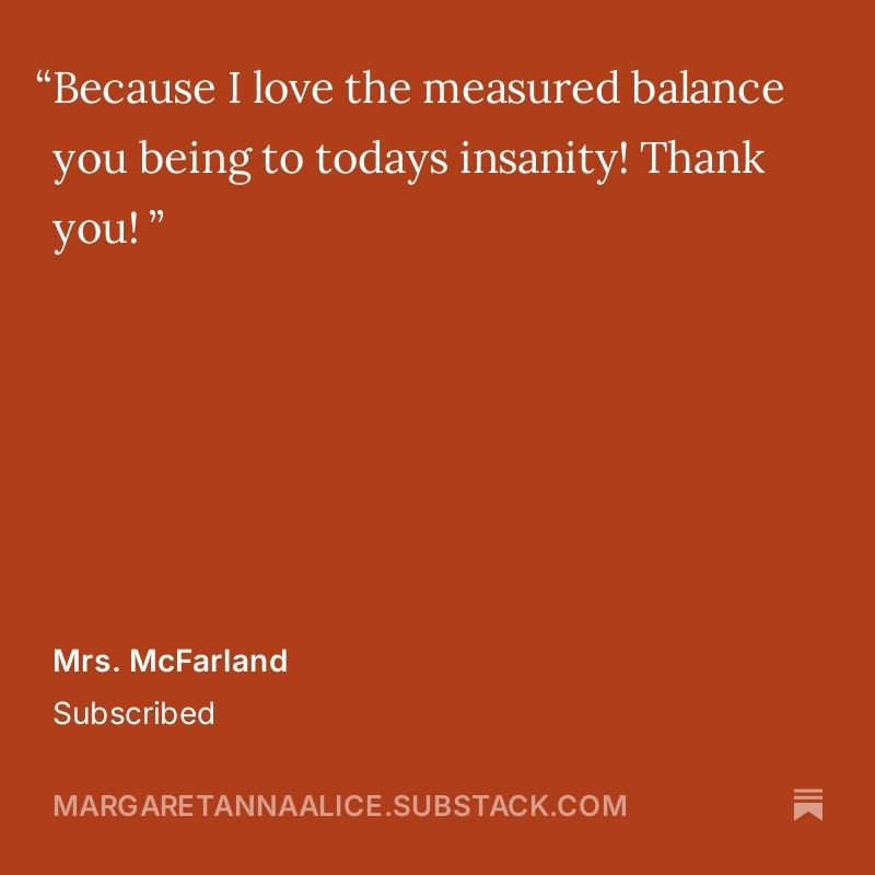 I especially want to thank those of you who have taken the time to write a private message to me when you subscribe. I read and cherish each note.